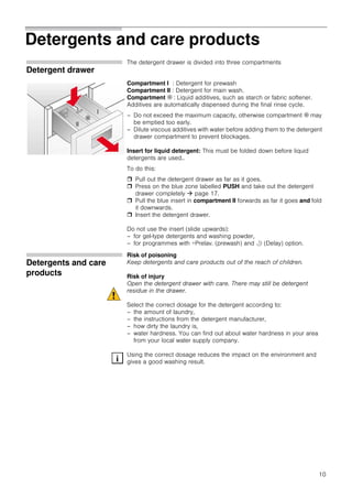 When your dishwasher displays one of these three symbols it needs your attention. Please take a few minutes to read and become familiar with the advantages of your washing machine. II Detergent for the main wash water softener bleach stain remover Compartment.